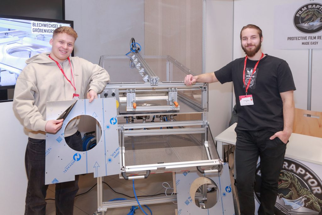 Unsere Idee für Jugend Forscht entstand aus einem Problem, welches bei der Fertigung eines unserer Produkte entsteht. Aus den Produktionsinseln kommen immer wieder die Beschwerden über die vom Lieferanten, ausgelaserten Aluminium Bleche. Diese sind nämlich zum Schutz mit einer Klebefolie versehen. Die Kollegen aus der Montage müssen die Folie bislang mit einem improvisierten Aufsatz für den Akkuschrauber abziehen, was einen großen Aufwand darstellt, viel Kraft benötigt und die Folie kaum sauber von den Blechen abzieht. Unser Ziel ist es, diesen Prozess weitestgehend zu automatisieren, um den Mitarbeitern der Produktion Zeit und Kraft zu sparen. Nach mehreren Absprachen und verschiedenen Testversuchen sind wir zu dem Schluss gekommen, dass ein Tisch, welcher die Folie mechanisch über Pneumatik-Zylinder abzieht, die wirtschaftlichste und für unsere Anwendung sinnvollste Lösung ist.