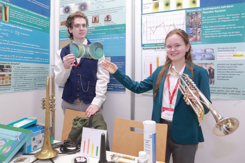 In Blechblasinstrumenten bildet sich Grünspan, da die Essigsäure im Atem mit Kupfer im Messing reagiert. Da Kupfersalz gesundheitsschädlich ist, muss es entfernt werden. Dies ist schwierig, da die Innenwände schlecht zu erreichen sind. Eine Reinigung beim Fachmann ist teuer. Wir haben nach umweltfreundlichen Methoden gesucht, bei denen wir uns auf die Trompete beziehen. Für die Entfernung von Grünspan verwenden wir ein kleines Ultraschallgerät, Ascorbinsäure und Alufolie um die Lösung durch Reduktion der Kupferionen umweltfreundlich zu entsorgen. Unsere Methode ist günstig und lässt sich einfach zuhause durchführen. Zur Prävention setzen wir Lack oder Fett als Barriere zwischen Essigsäure und Messing ein. Dafür testeten wir Beschichtungen, damit diese den Klang der Trompete nicht verändern. Sie verhindern, dass sich Grünspan im Instrument bildet. Durch unsere Forschung erleichtern wir Musikern die Pflege des Instruments, reduzieren die Kosten und schützen die Gesundheit und Umwelt.