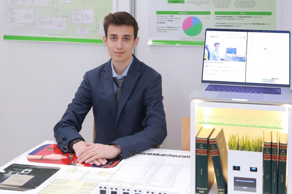 Der Roboter erkennt Sprache, analysiert Emotionen und gibt einfühlsame Antworten. Die KI läuft auf einem Raspberry Pi 5 und wird mit „Hey Mental Mint“ aktiviert. Zwei OLED-Augen und ein LCD-Display zeigen Reaktionen. Programmiert ist alles in Python. In einer Befragung von 100 Schülern aus meiner Schule (15-19 Jahre) wurde der Roboter mit ChatGPT verglichen. In 6 Belastungssituationen fand die Mehrheit die Antworten von Mental Mint hilfreicher. Geplant ist Mental Mint für Zuhause und Schulen, als ausleihbares Gerät wie ein Buch, damit jeder Unterstützung nutzen kann, wenn sie gebraucht wird.