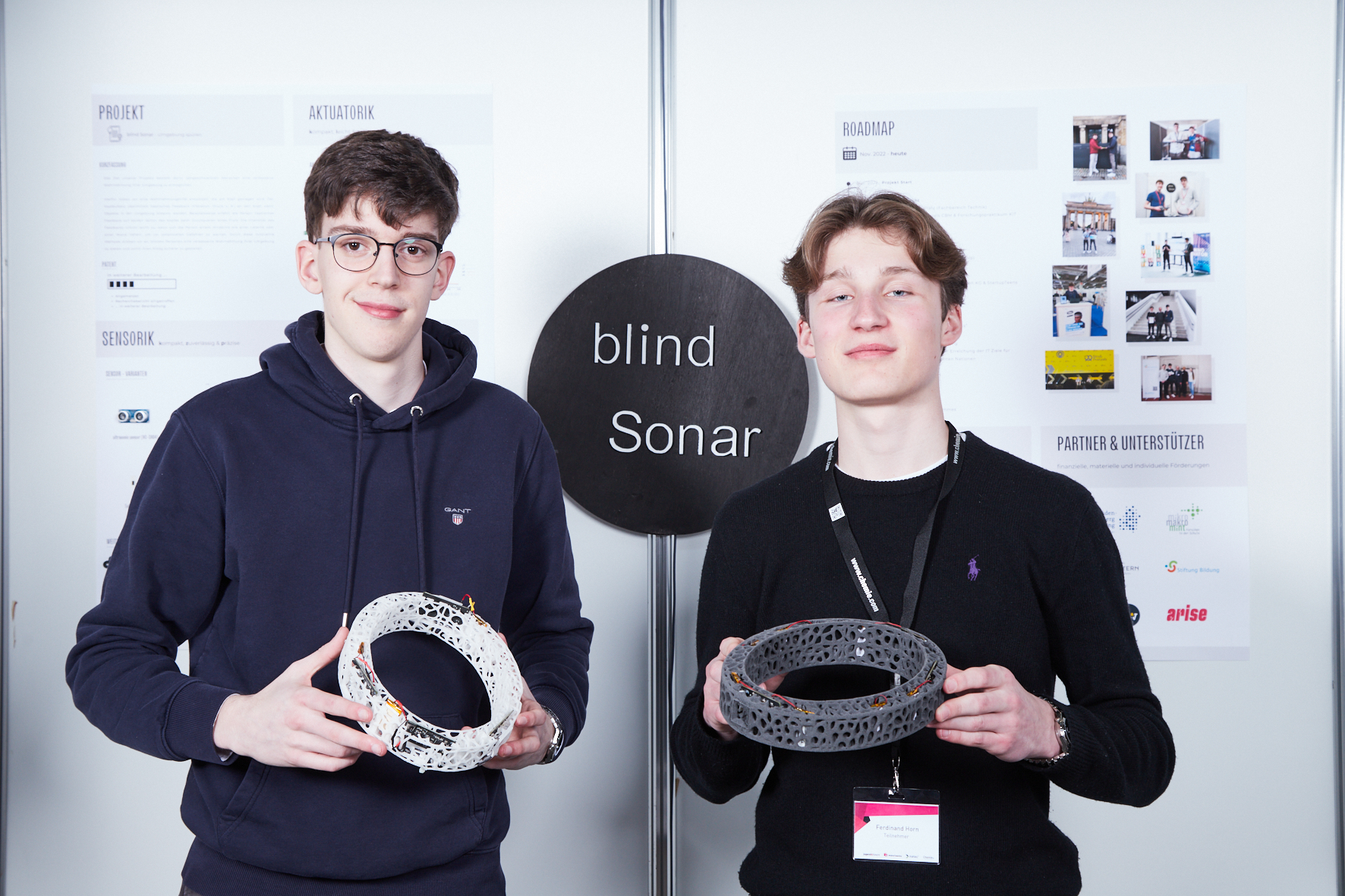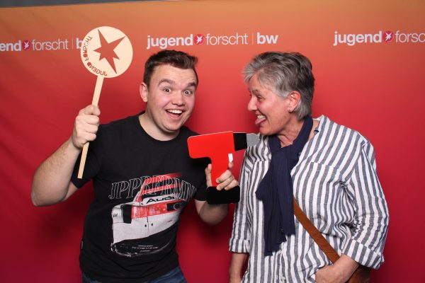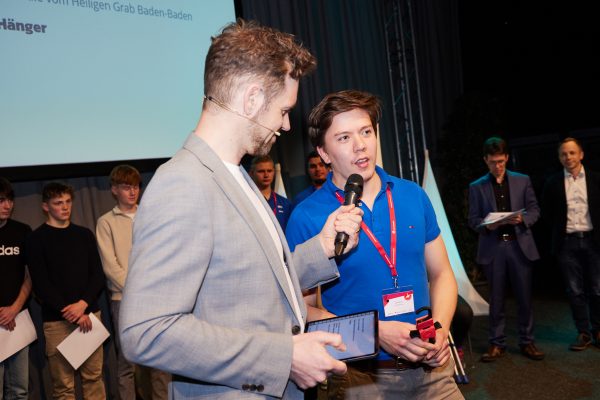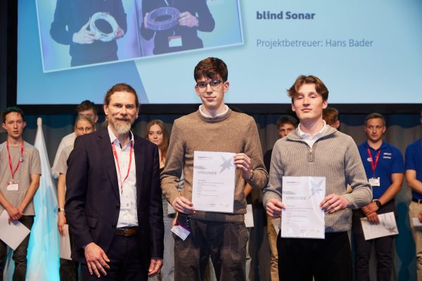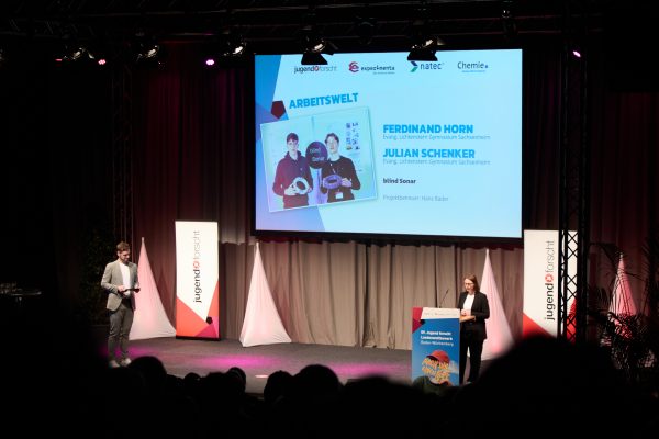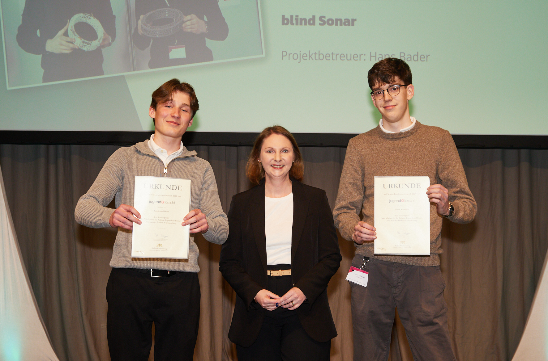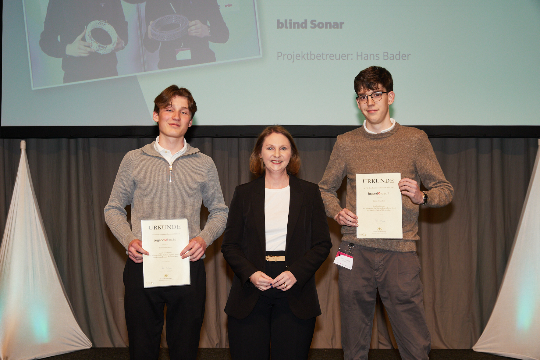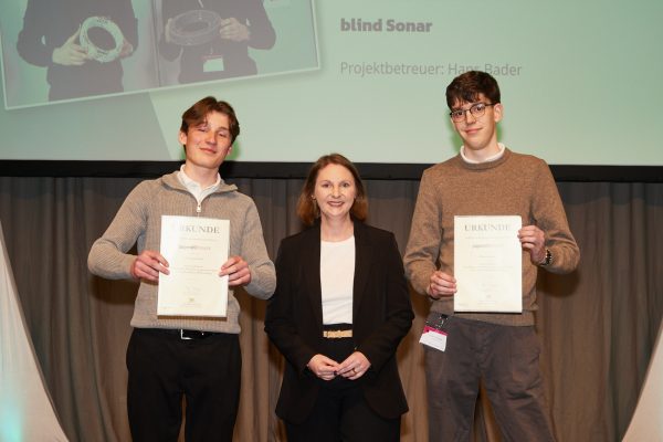 Nach einem Rundgang durch die Ausstellung mit Austausch mit den Teilnehmenden zu ihren Projekten überreichte Frau Boser den diesjährigen Preis der Kultusministerin, der in diesem Jahr an Ferdinand Horn und Julian Schenker vom Evang. Lichtenstern-Gymnasium Sachsenheim mit ihrem Projekt Blind sonar verliehen wurde. Herzlichen Glückwunsch!
