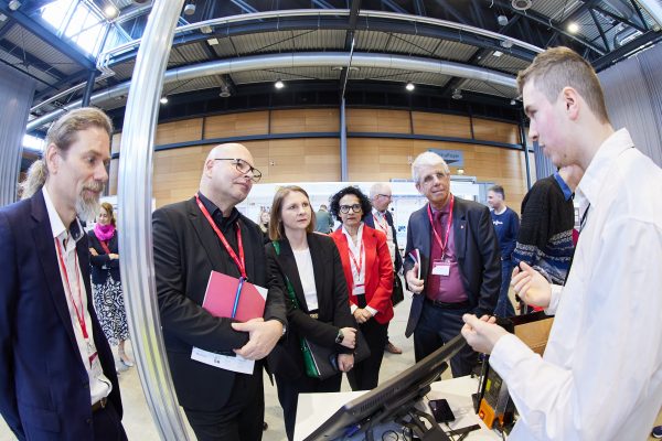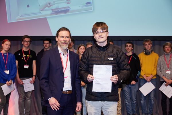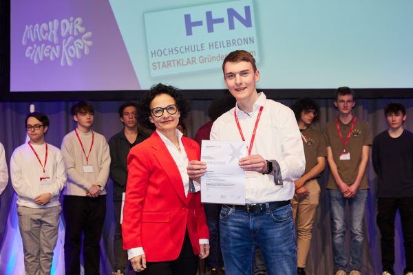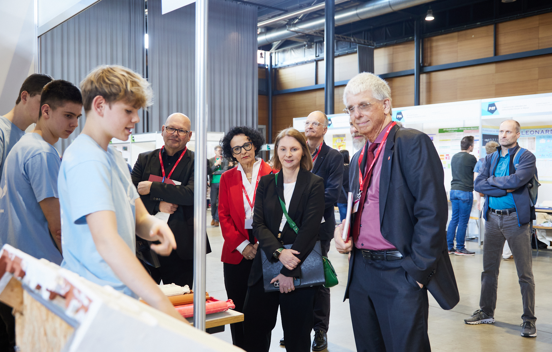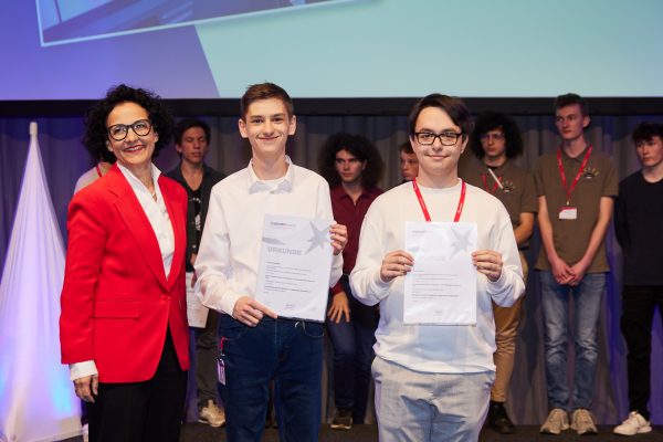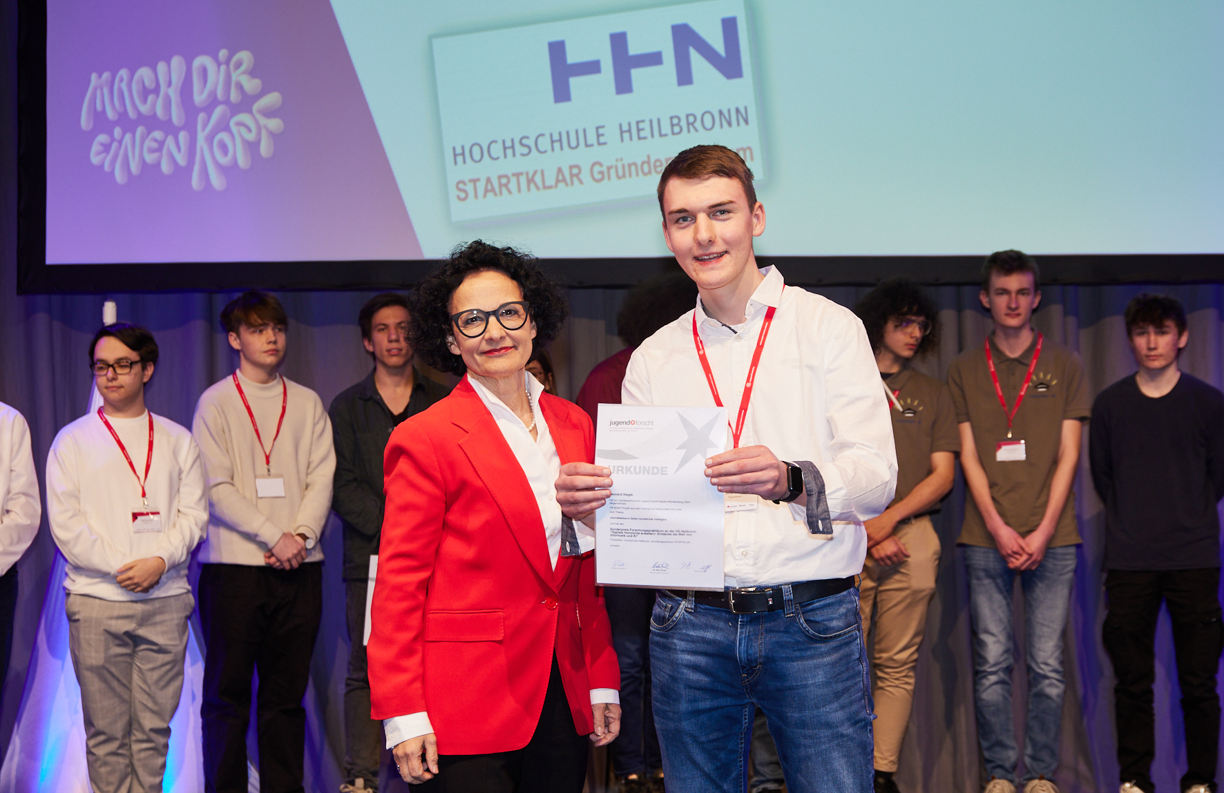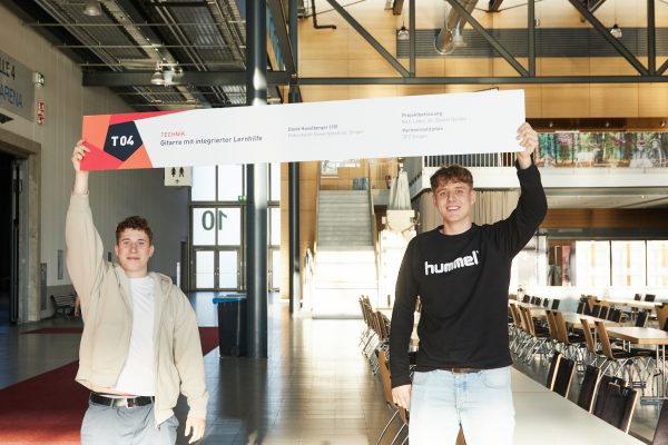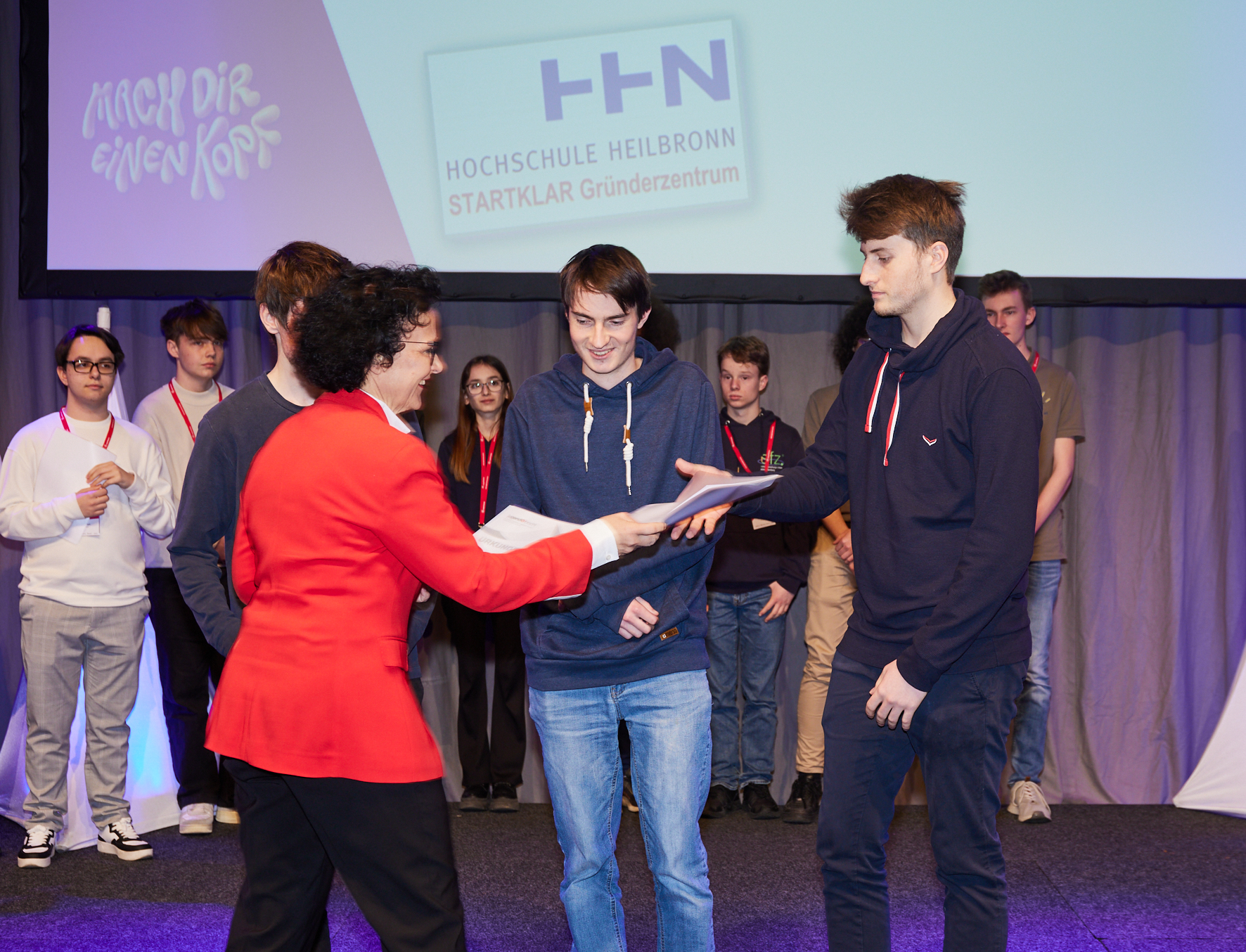 Nach einem Rundgang durch die Ausstellung mit Austausch mit den Teilnehmenden zu ihren Projekten überreichte Frau Boser den diesjährigen Preis der Kultusministerin, der in diesem Jahr an Ferdinand Horn und Julian Schenker vom Evang. Lichtenstern-Gymnasium Sachsenheim mit ihrem Projekt Blind sonar verliehen wurde. Herzlichen Glückwunsch!